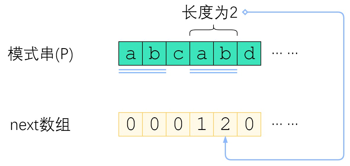 上图给出了一个例子。P=”abcabd”时,next[4]=2,这是因为P[0] ~ P[4] 这个子串是”abcab”,前两个字符与后两个字符相等,因此next[4]取2. 而next[5]=0,是因为”abcabd”找不到前缀与后缀相同,因此只能取0.