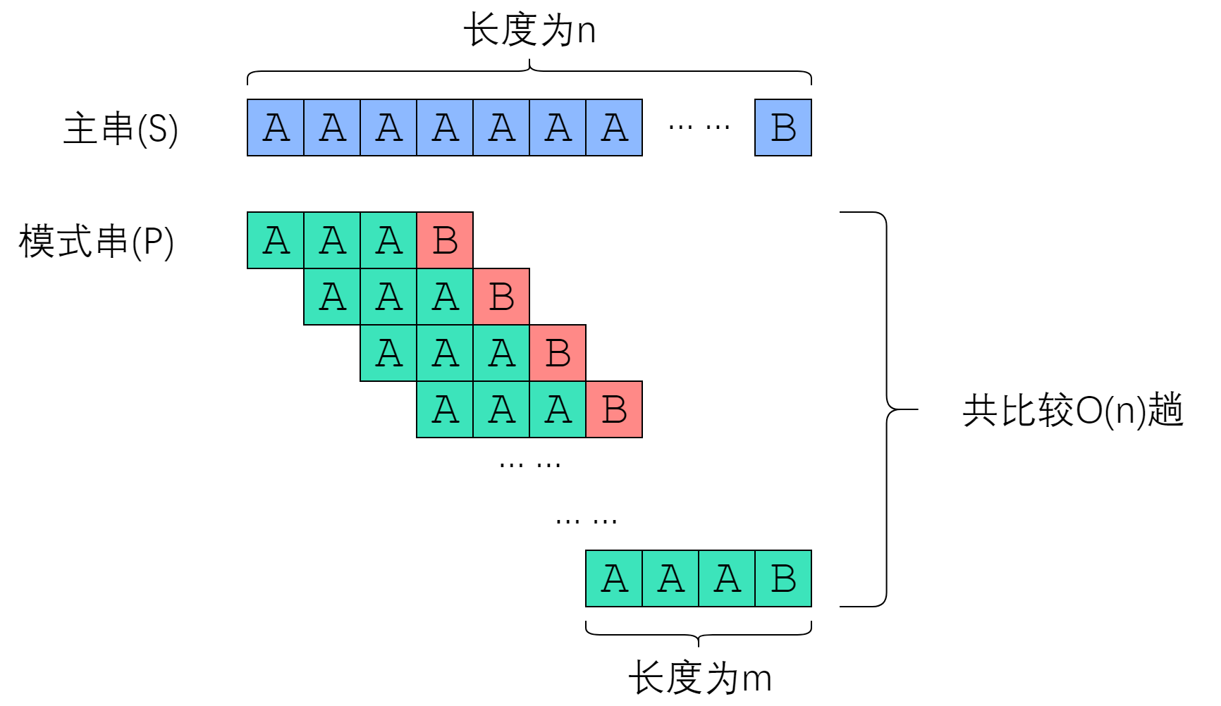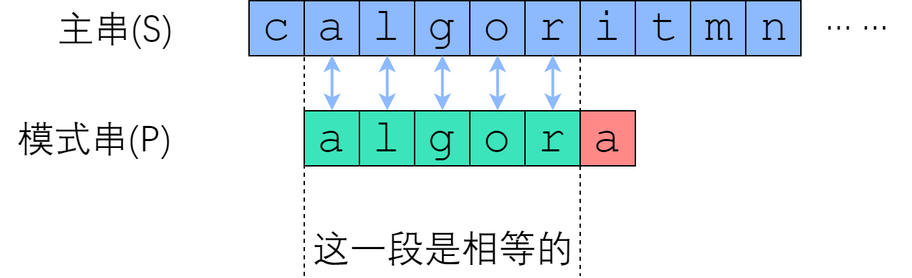 我们应该如何移动这把标尺?很明显,如图中蓝色箭头所示,旧的后缀要与新的前缀一致(如果不一致,那就肯定没法匹配上了)!