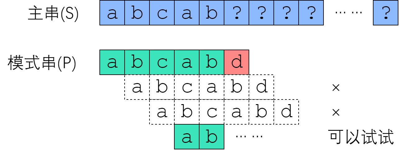 首先,利用上一节的结论。既然是在 P[5] 失配的,那么说明 S[0:5] 等于 P[0:5],即”abcab”. 现在我们来考虑:从 S[1]、S[2]、S[3] 开始的匹配尝试,有没有可能成功?