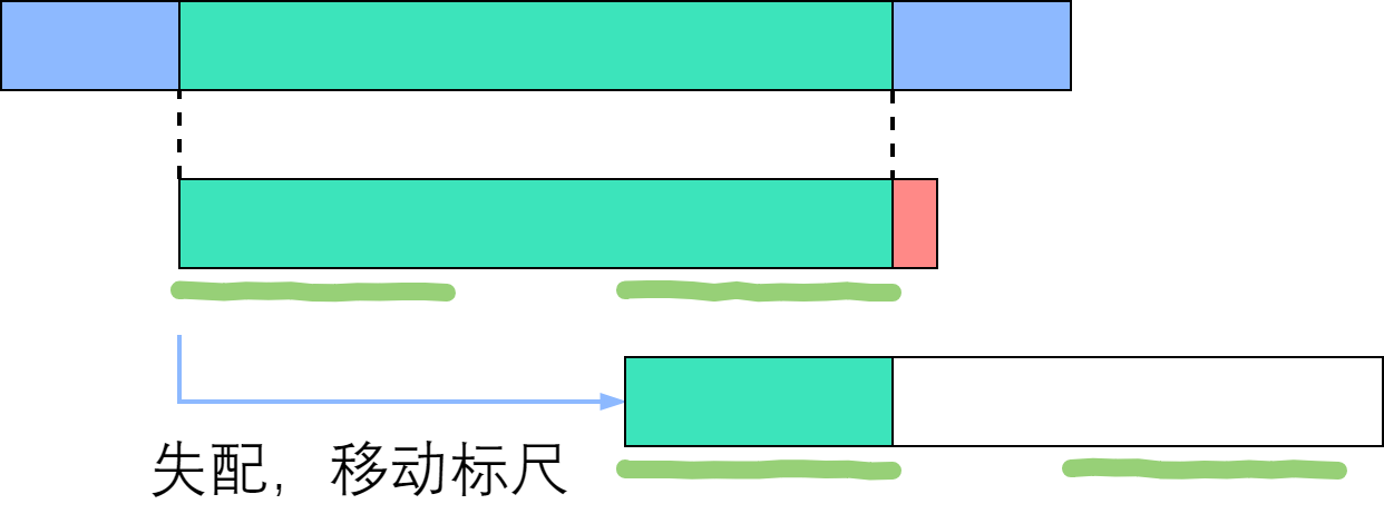 如上图所示,绿色部分是成功匹配,失配于红色部分。深绿色手绘线条标出了相等的前缀和后缀,其长度为next[右端]. 由于手绘线条部分的字符是一样的,所以直接把前面那条移到后面那条的位置。因此说,next数组为我们如何移动标尺提供了依据。接下来,我们实现这个优化的算法。